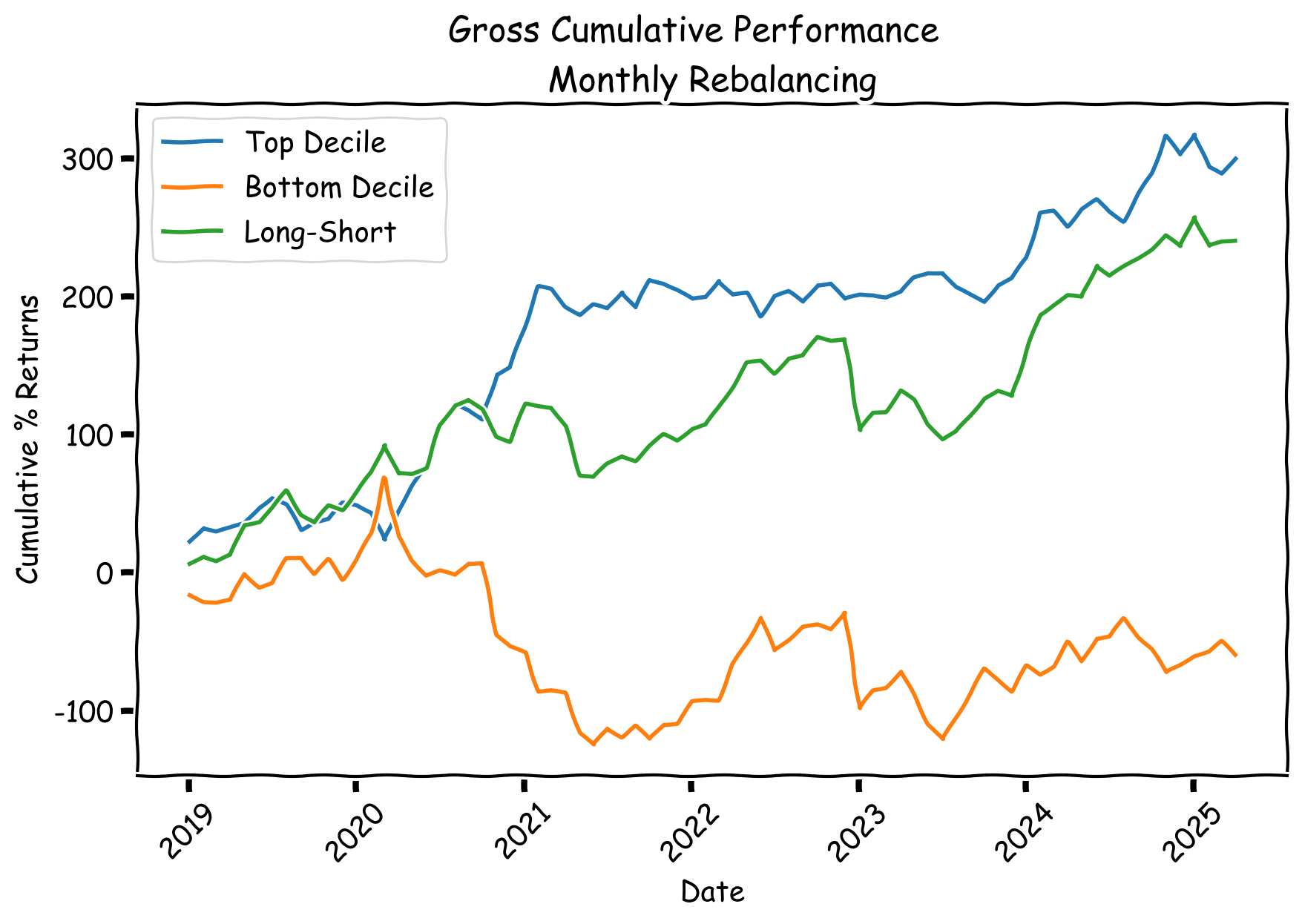 As demonstrated, this sample portfolio performed as expected, with the net average return of the long basket outperforming that of the short basket over the same period.