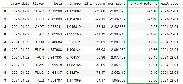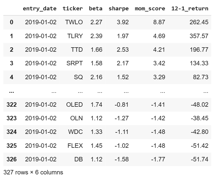 We create a metric, mom_score (momentum score), that’s essentially the beta multiplied by the sharpe ratio.
