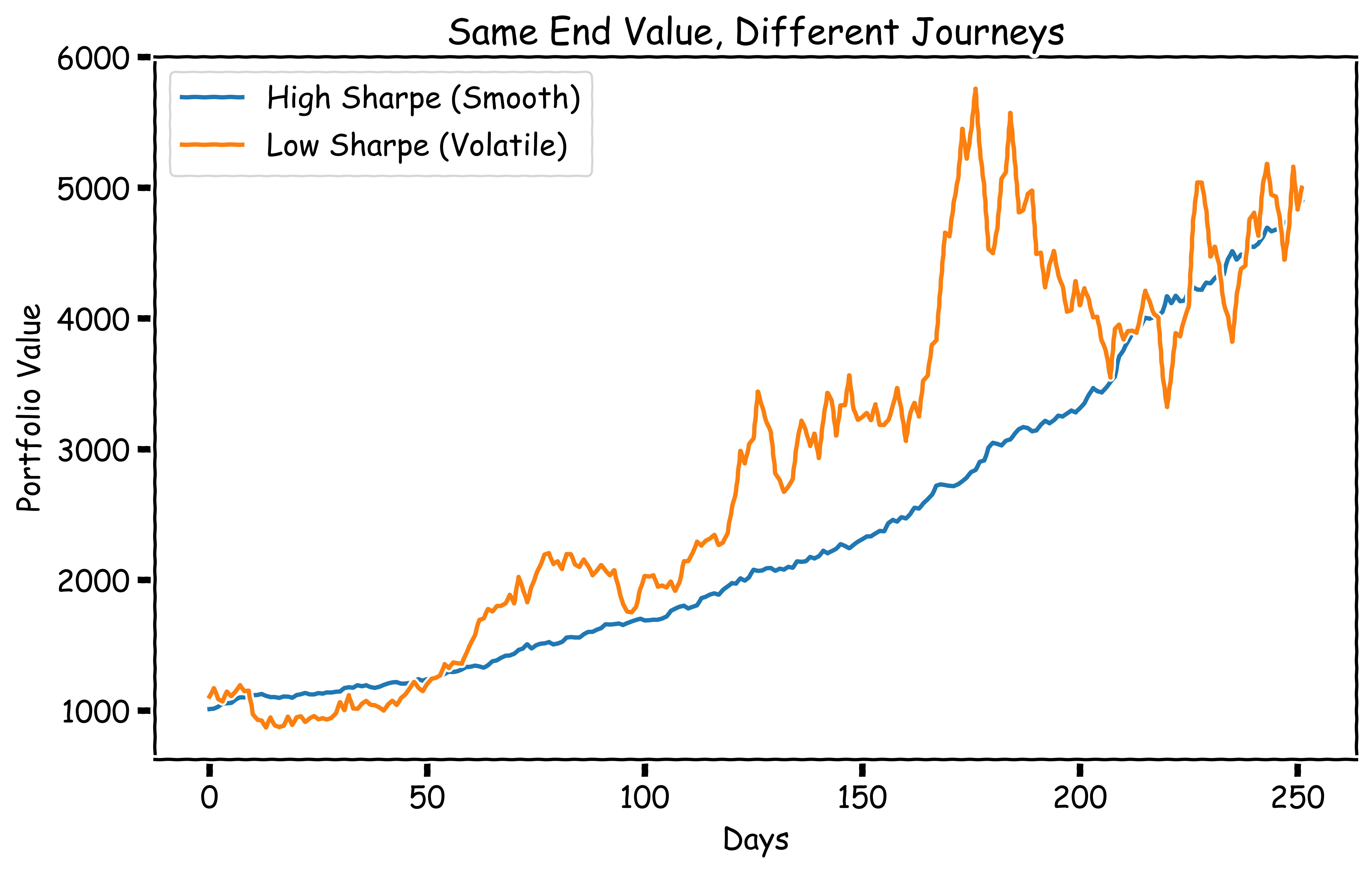 The sharpe ratio is just a measure of risk-adjusted returns — if the stock went up in a straight line with minimal volatility, the sharpe ratio will be high — if it went up with major volatility, it’ll be lower: