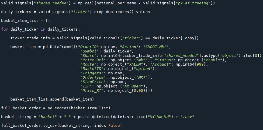 We first generate the daily basket in Python by iterating through the names in our toxic index and writing the orders for submission: