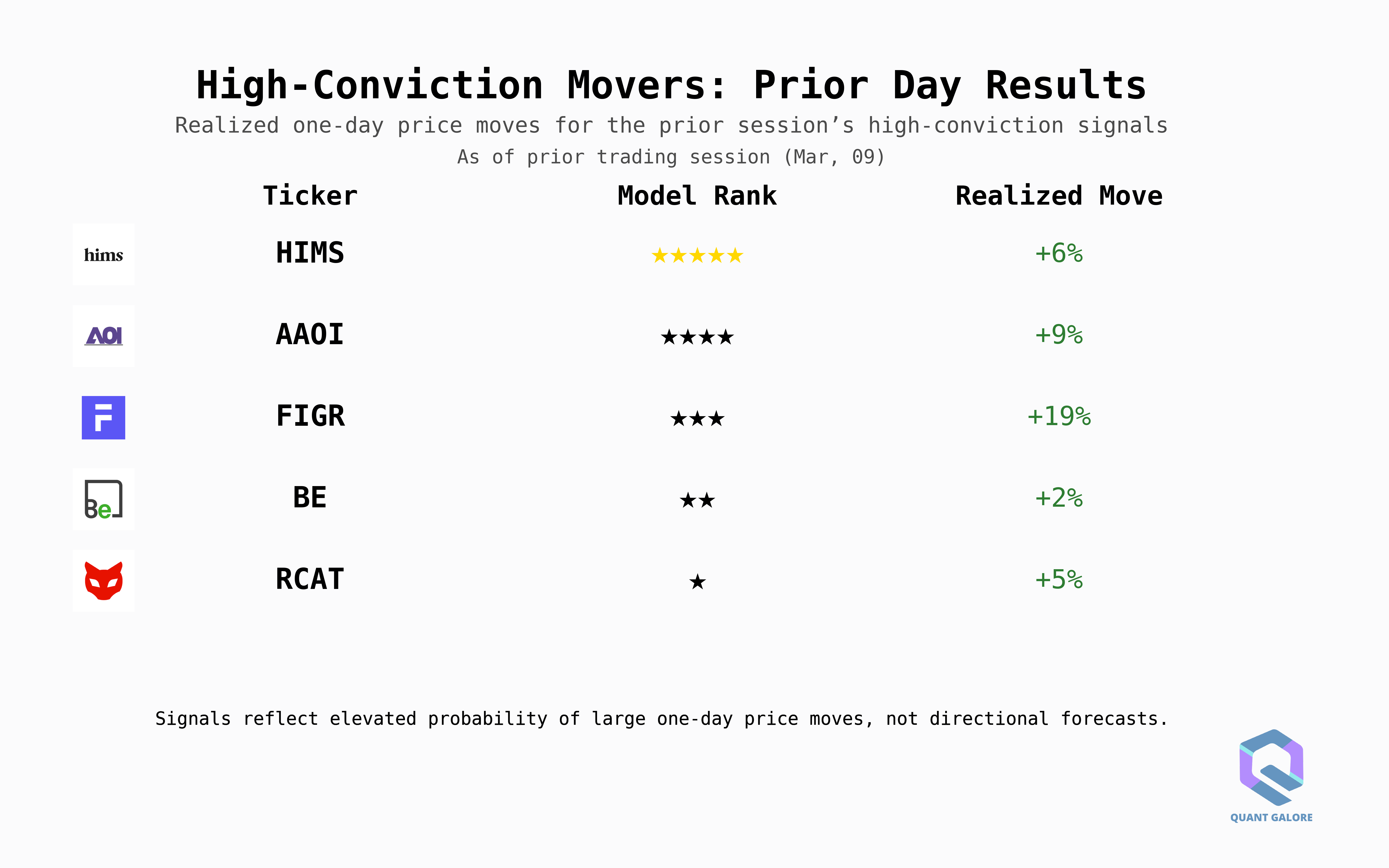 Each trading day, the system identifies the five equities most likely to experience a large realized move the following day.