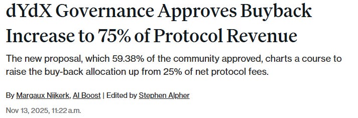 For instance, a name in our short basket, DyDx, recently approved a new proposal that would direct 75% of trading fees collected into buybacks of the DyDx token: