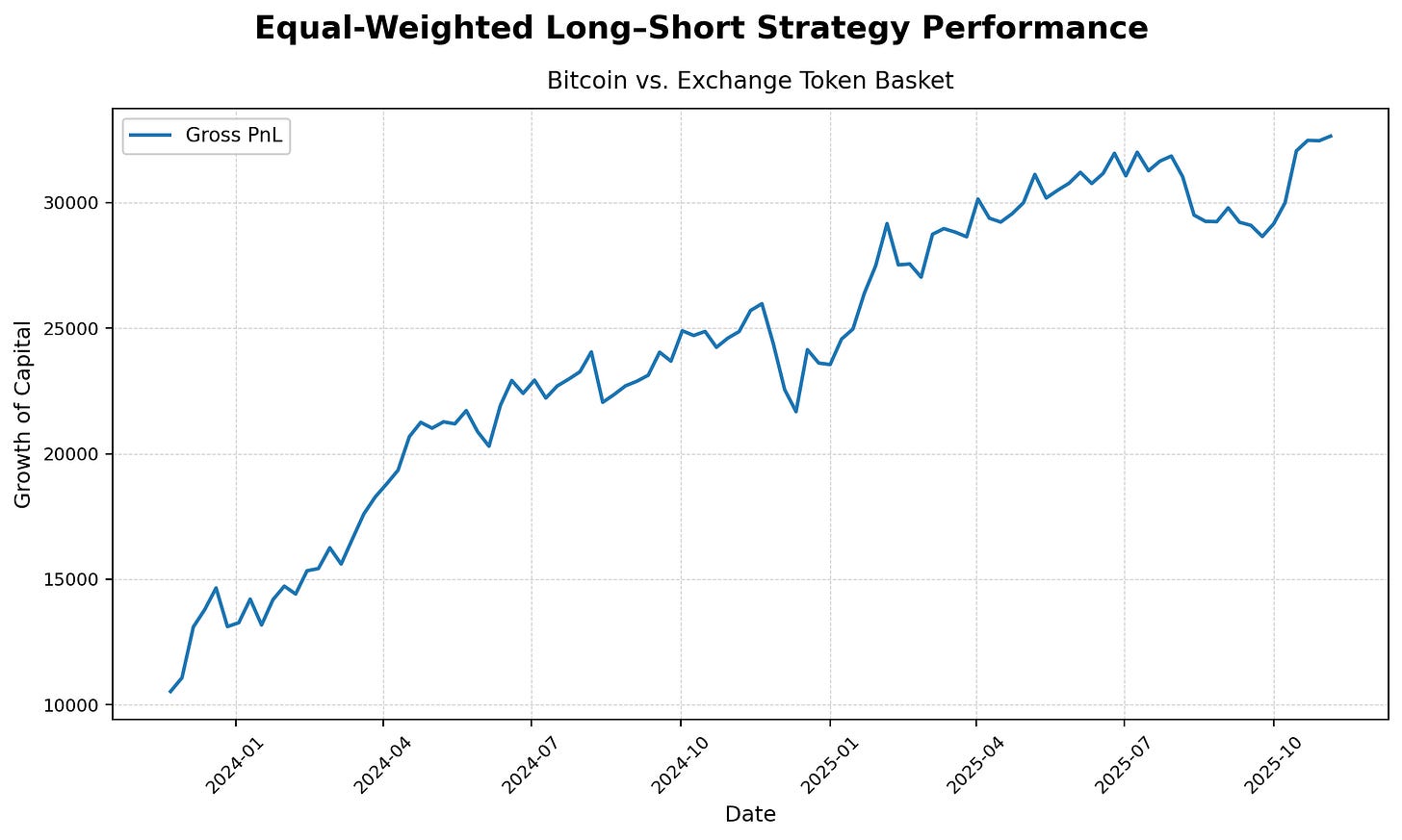 We profit if the exchange tokens deteriorate more than Bitcoin over the time period: