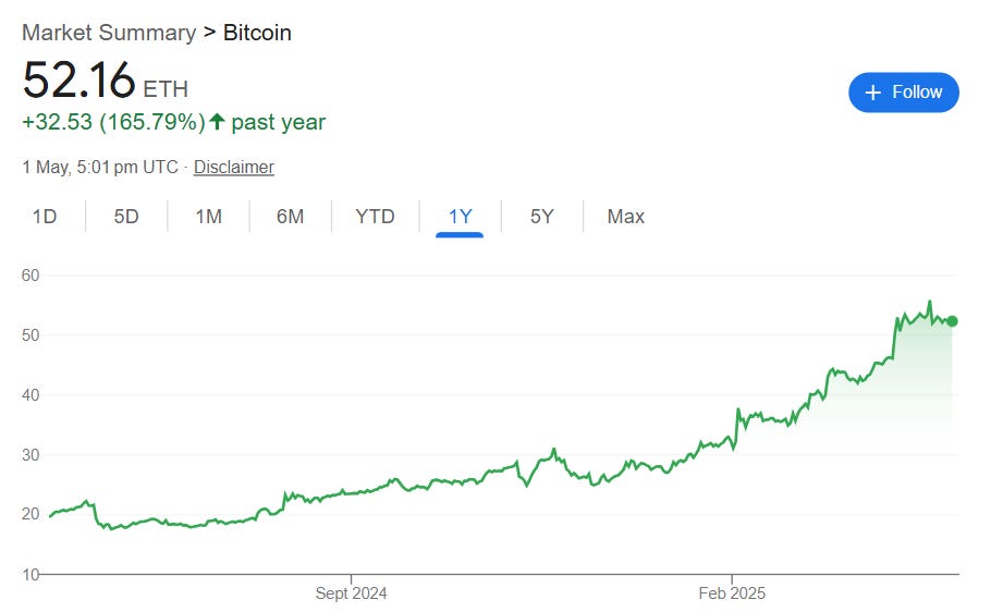 The rationale for choosing ETH was that it was the “little brother” of Bitcoin, but with some effort, we could probably find something with a stronger reason for why the trade should exist.